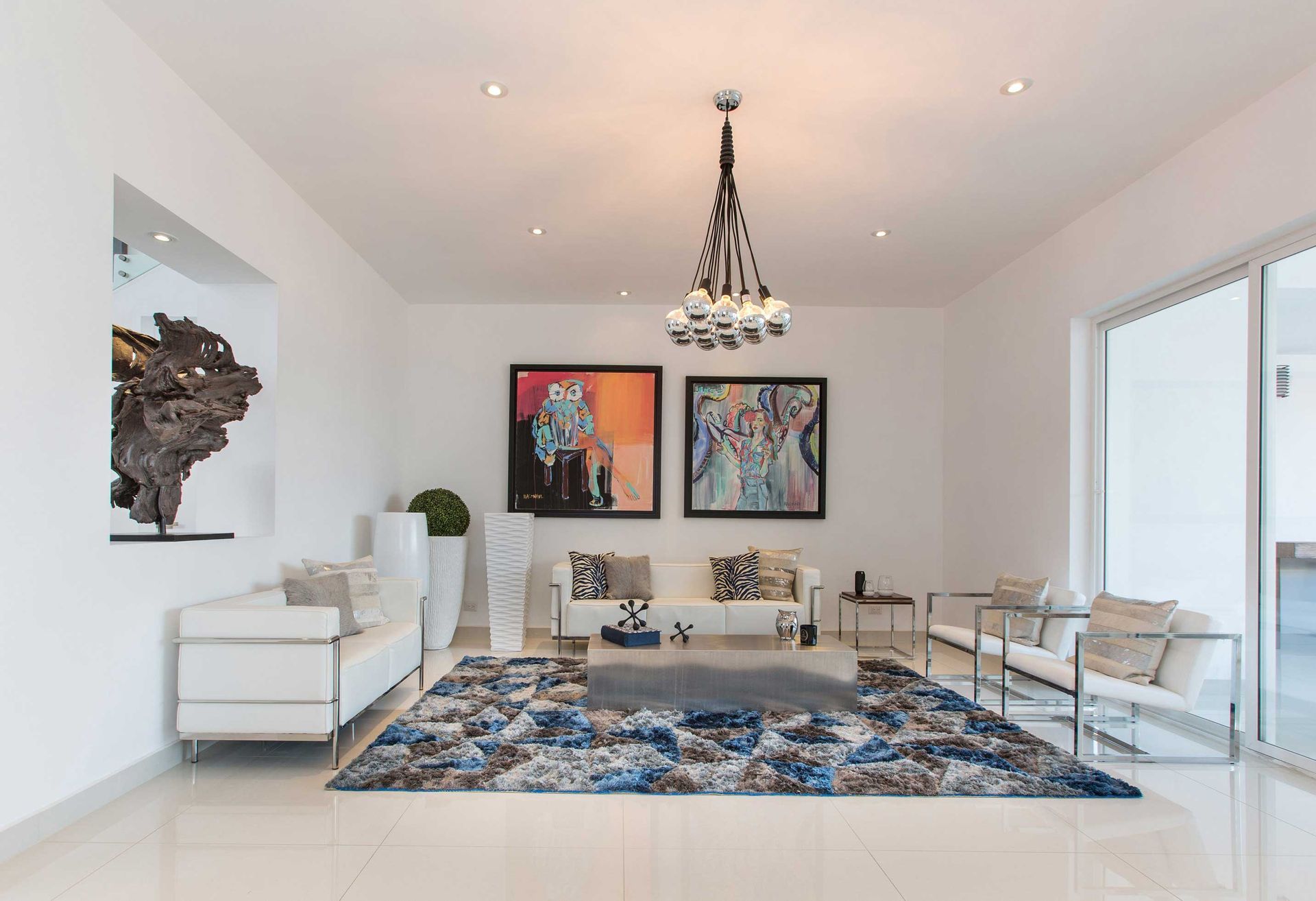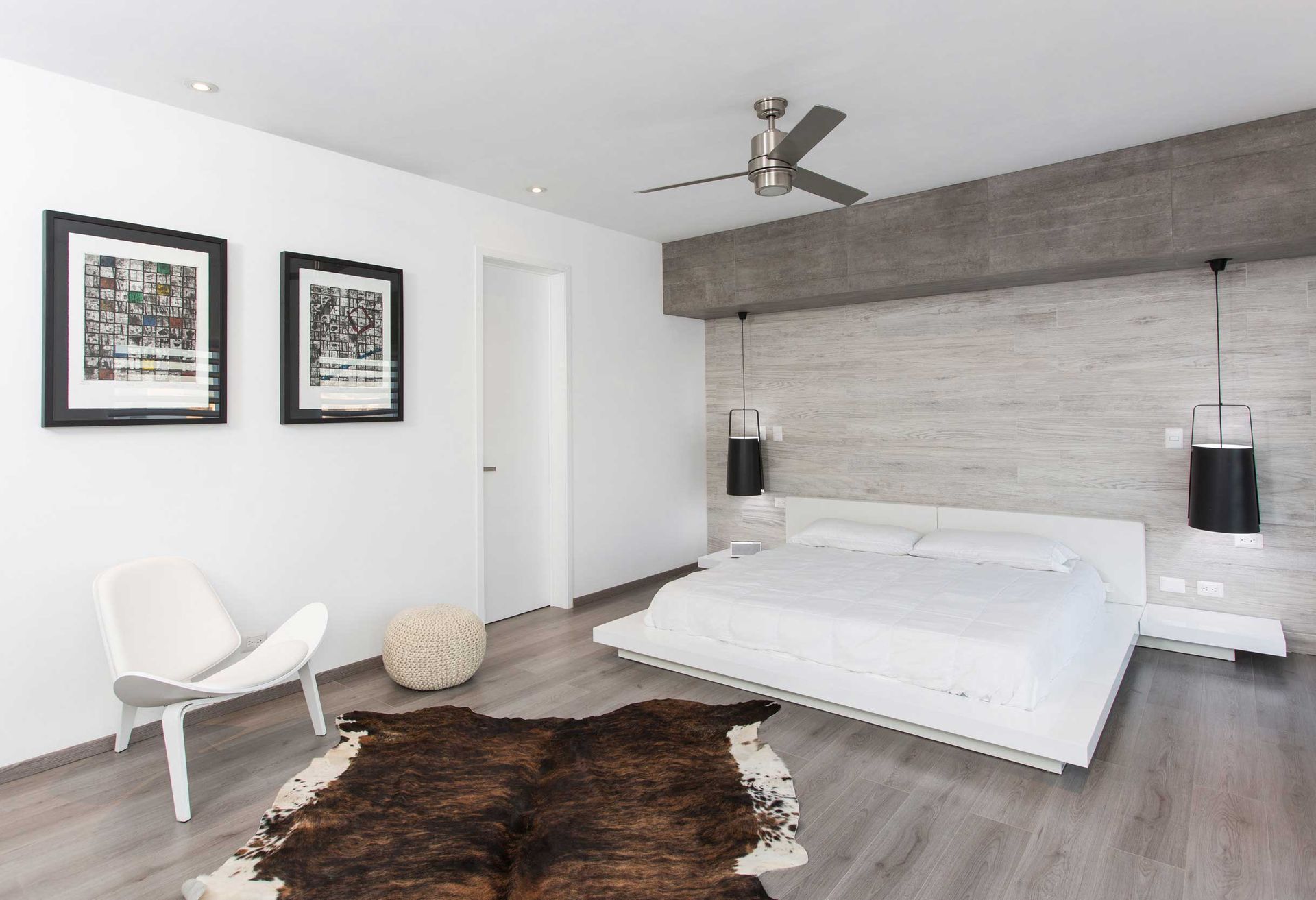 Cada habitación de la casa tiene detalles decorativos como lámparas, obras de arte, texturas del mobiliario que se convierten en protagonistas y hacen de cada lugar único y agradable. En fachada como en el interior predomina una geometría muy sencilla en color blanco que se contrasta con recubrimientos de piedra tipo cantera en tonos de grises.