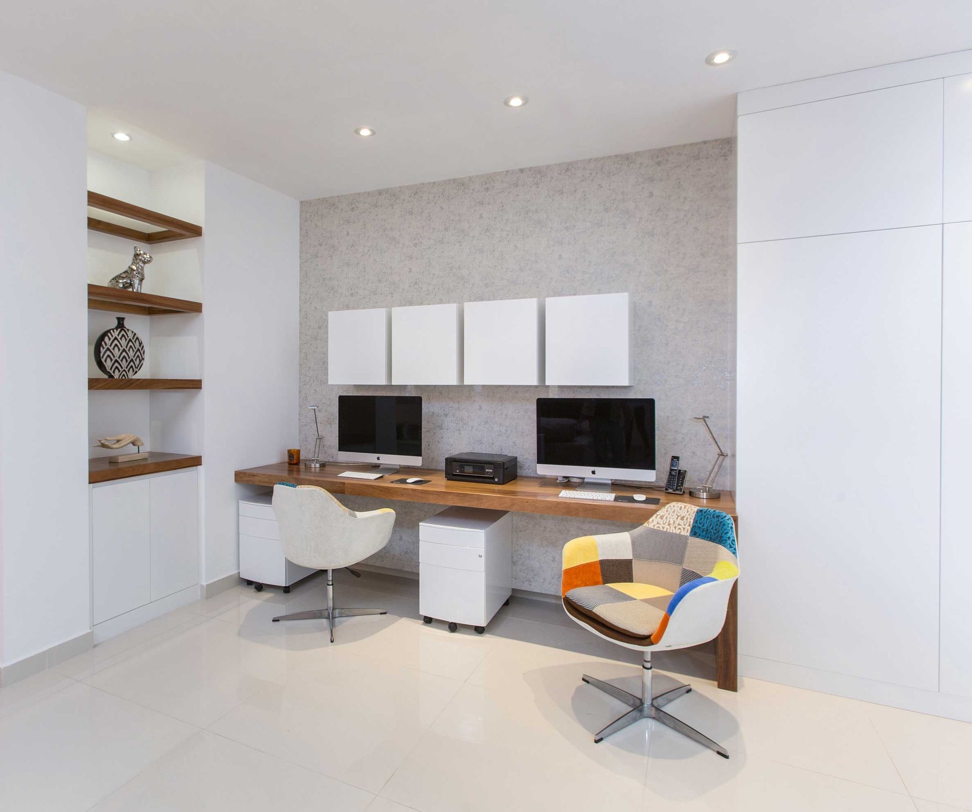 En el segundo nivel se encuentra el área de las habitaciones, vestíbuladas por una gran estancia/estudio, este espacio se integra a la doble altura de las escaleras. En el interior predomina el color blanco, en los muros, techos y pisos.