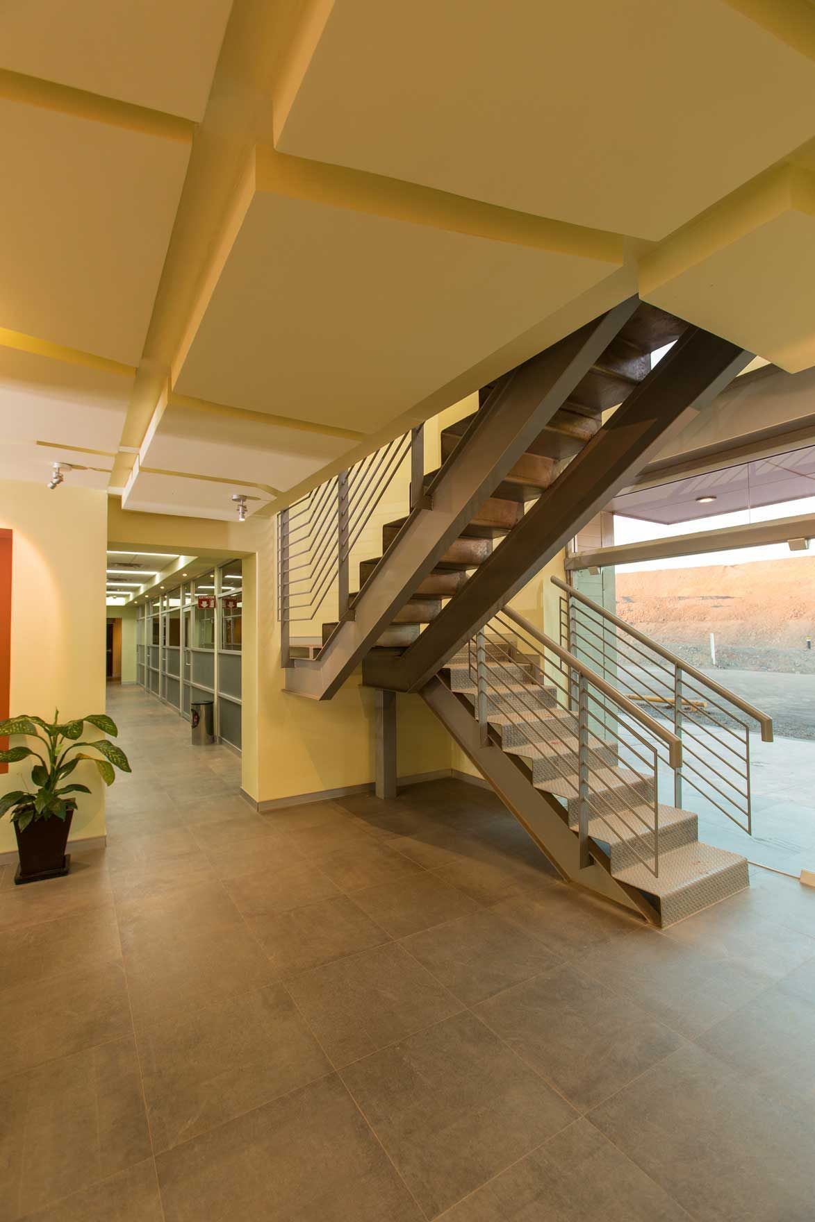Al ingresar al edificio por el acceso principal te recibe un gran vestíbulo con vista al tajo, en este espacio se expone una maqueta a escala con los distintos tipos de vehículos que operan en la mina. A los extremos se desarrollan las distintas áreas de cubículos y oficinas operativas propias del control vehicular las cuales se comunican por medio de pasillos que de igual manera rematan en dos módulos de servicios los cuales cuentan con sanitarios, área de copias e impresiones, site, cocineta, comedor, cuarto de limpieza, cuarto de máquinas y salidas de emergencia.